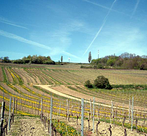(広大なワイン畑=山の高台には強い風を利用した風力発電が盛ん)