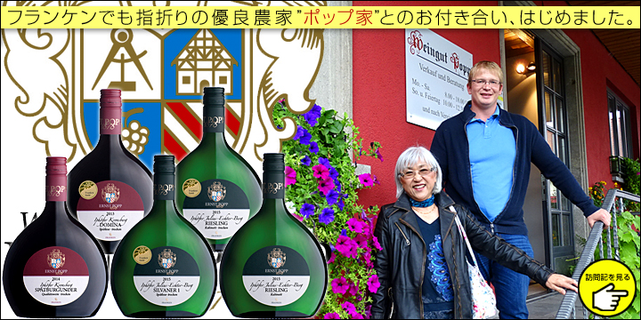 フランケンの新規お付き合い農家さんを探して早5年。 何軒も何軒も試飲をしに行って考え続けていたのですが、、、 ようやく納得するワイン農家を見つけることが出来ました!! それがここ、ポップ家です!! ローテンブルクにお店を構えて11年。 お客様が「フランケンワインを求めている」というのをひしひしと感じ続けていました。 丸型のボトルで有名なフランケンワインに対する興味を持った方々を満足させるには 品質はもちろん、コスパ、品揃えのバラエティ、そして私達にとっては農家の人柄といった 厳格な基準をいくつもクリアしなければなりません。 それが今まではキルヒ家、ライス家の2軒だけでした。 そこにもうひとつフランケンでも有数の優良農家で かつ若い醸造家さんの農家・ワイナリー、ポップ家が新たに加わります!!
